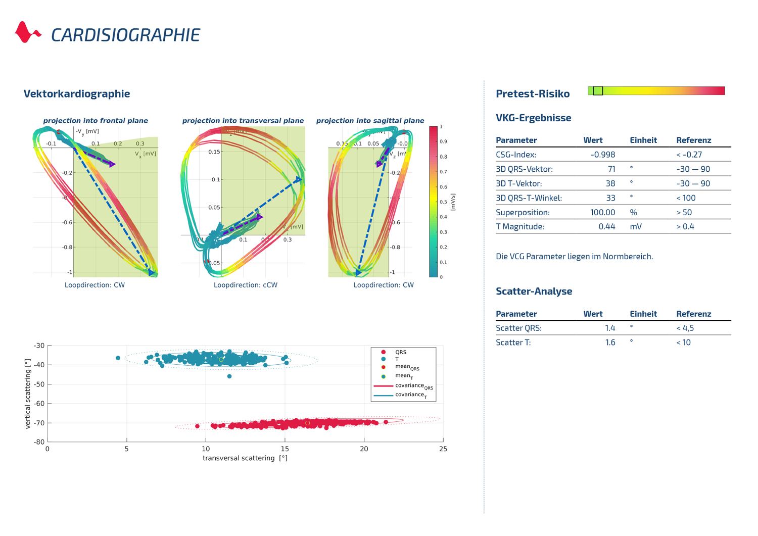 Darstellung der Vektorschleifen in drei Ebenen. Dazu Farben (Geschwindigkeit), Drehrichtung sowie Blockbilder. Ebenso Darstellung der wichtigsten Vektorkardiographischen Parametern inklusive des CSG-Index der ein starker Indikator für ischämische Veränderungen ist. Zwei wichtige Parameter, Scatter QRS und Scatter T werden gesondert dargestellt. Pretetst Risiko falls vorher spezifiziert wird angegeben.