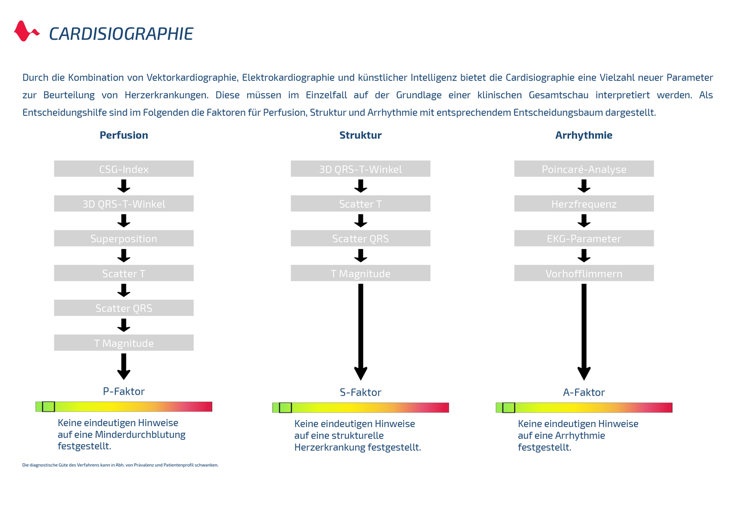 Hier werden sämtliche auch von konventionellen EKG-Systemen bekannte Parameter aufgelistet und mit Normwerten abgeglichen. Abweichungen werden automatisch ausgegeben.