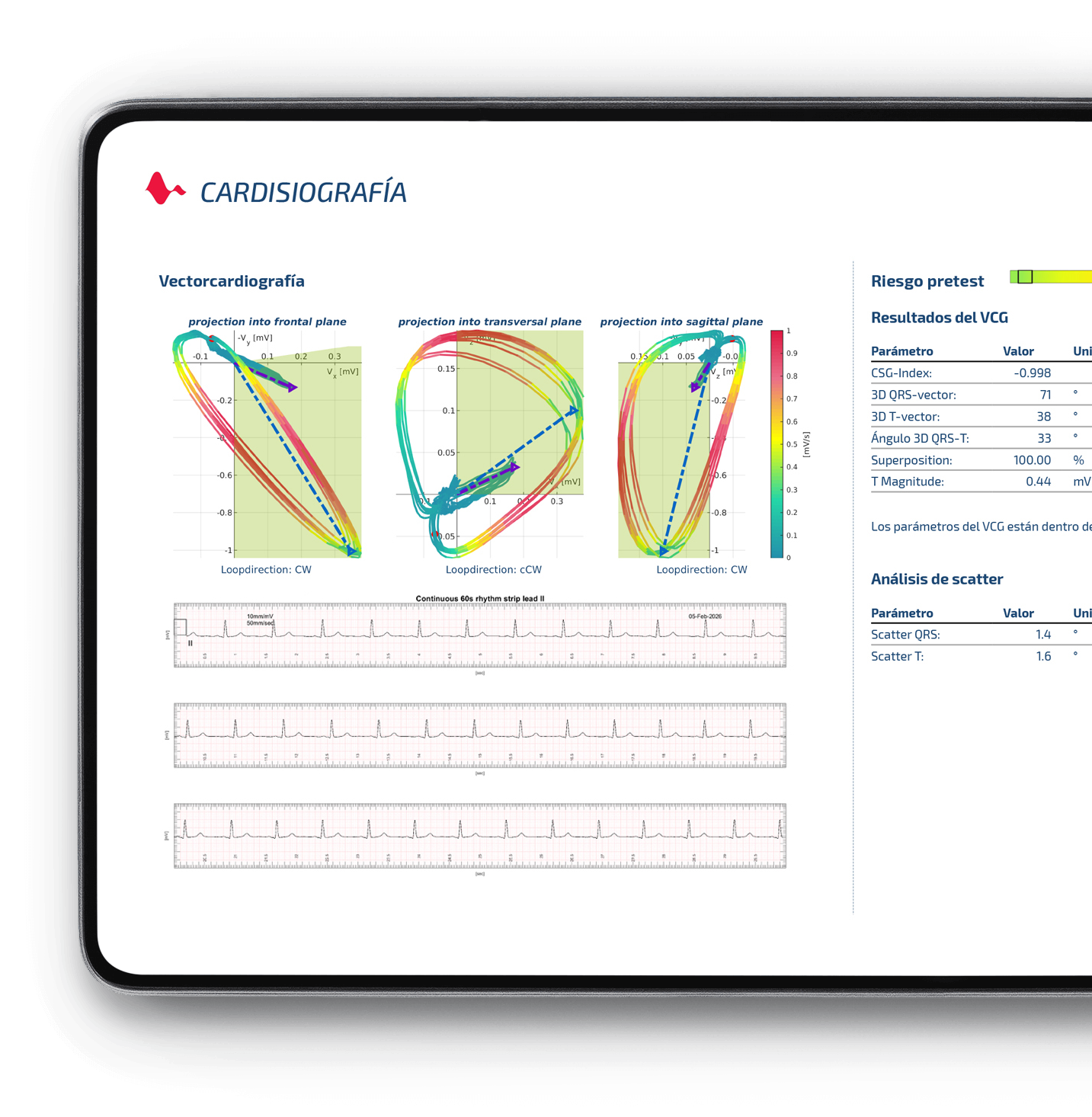 evaluación completa del estado cardíaco, incluyendo parámetros conocidos de VCG y ECG. El informe, fácil de interpretar, apoya el diagnóstico de isquemia, arritmias y enfermedades cardíacas estructurales.