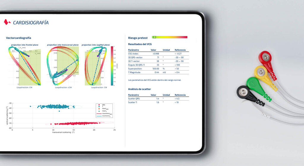 Representación de los lazos vectoriales en tres planos, con codificación por colores (velocidad), sentido de rotación y bloques de activación. También se muestran los principales parámetros vectorcardiográficos, incluido el índice CSG, un fuerte indicador de alteraciones isquémicas. Dos parámetros clave, Scatter QRS y Scatter T, se presentan por separado. Si se ha especificado previamente, se indica el riesgo pretest.